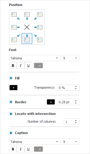 To set up a legend, use the tab in the Format group of tabs on the side panel. Tab name depends on the legend to be set up. The following legend types are available: