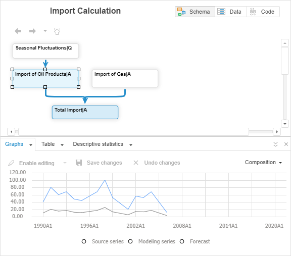 An equation is used to calculate the output variables by transforming the input variables with statistical and mathematical methods. Calculations are executed taking into account calendar frequency of the model (years, half-years, quarters, months and days).