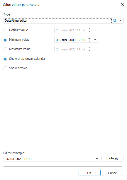 Default Value. Determine the time and date value to be displayed in the editor by default. This value must be in the range of available values determined for the editor. If the range of available values for editor is not set, the value must be in the range from 01.01.1600 00:00 to 31.12.3000 23:59.