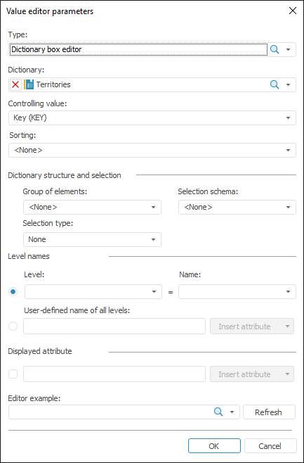 Dictionary. Use the drop-down list to select a dictionary, which elements are displayed in the editor.