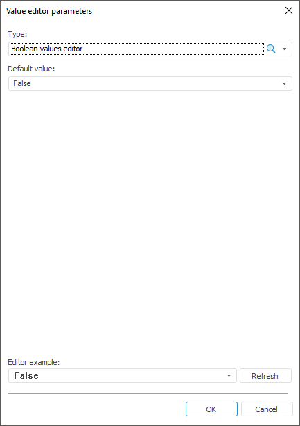 Like a radio button, the Boolean values editor has only two positions: True and False, but the position is selected in a drop-down list: