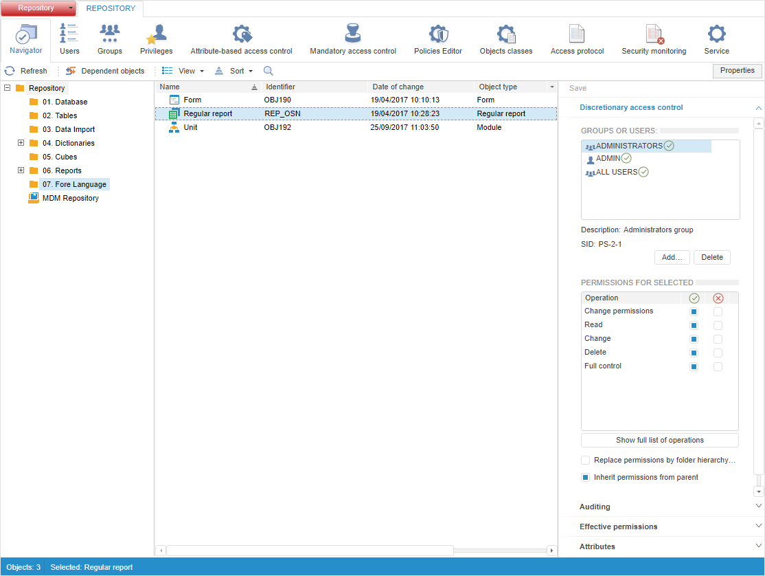 Security model objects of Foresight Analytics Platform include all application system objects: folders, tables, queries, views, dimensions, standard and virtual cubes, forms, reports, workspaces, and so on. Access to objects is regulated with access control rules.