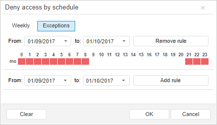 IMPORTANT. Denying access by specific dates has a higher priority than denying access by days of the week.