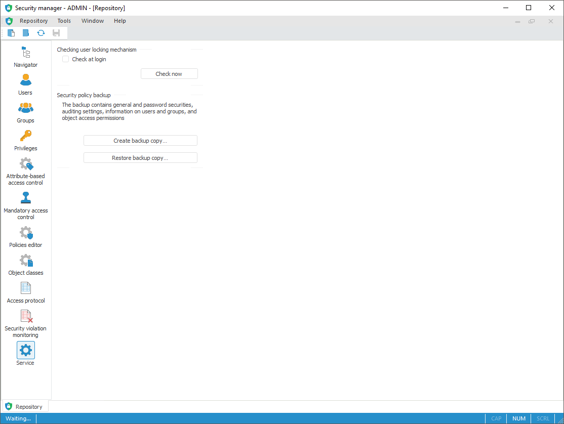 NOTE. Backup and restoring security policy is executed within one repository without possibility to create it in another repository. Security policy is restored, if the current version and restored version do not match.