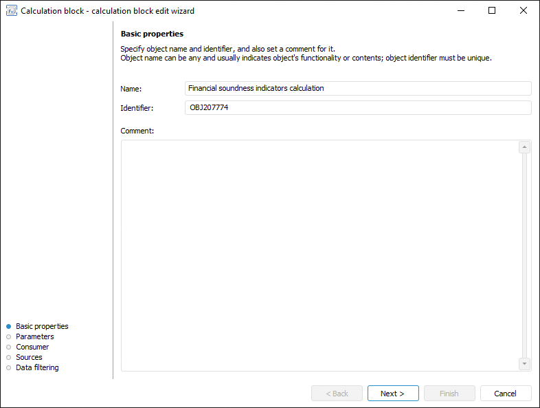Basic properties of calculation block can be set up on the Basic Properties page in the calculation block editing wizard: