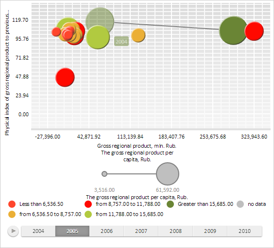 To execute this example, the HTML page must contain the BubbleChart component named bubbleChart (see Example of Creating the BubbleChart Component). Change time line step and redraw history for one of the bubbles: