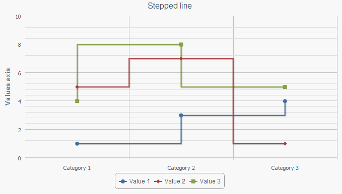 Different step position relative to series points is set for each data series: on the left, in the center and on the right.