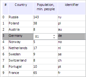 After executing the example double click the cell of the row with the number 3 and in the column named Population, mln. After this action a value editor is created in this cell: