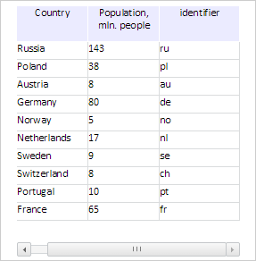 To execute the example, the HTML page must contain the DataGrid component named grid (see Example of Creating the DataGrid Component). Change width of the forth column and add a handler for horizontal scrollbar position change event: