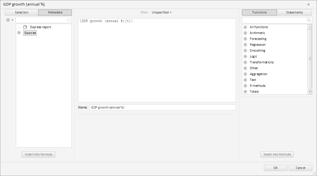 To execute the example, the HTML page must contain the TransformDialog component named dialog (see Example of Creating the TransformDialog Component). Open the Metadata tab on the component's left panel. Get the mode of displaying dimension metadata tree nodes: