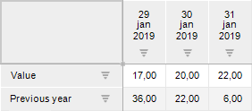 As a result of relation in the calculated fact formula, value for the Previous Year fact is taken from the same day of the previous year, for example: