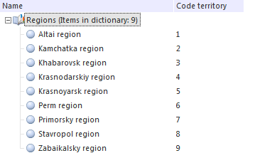 1. Dictionary with list of regions (MDM table dictionary, the DICT_REGION identifier):