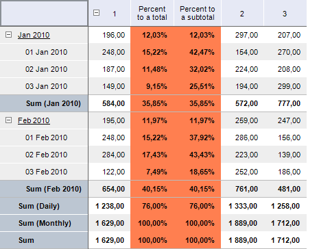 After executing the example clicking the button activates calculation of totals for an express report loaded into UiErAnalyzer1. Values sum is calculated by rows. Subtotals values are also calculated. Two calculated elements, executing calculation on a base of values of the first factor that is in a selection for the first column, are created. The first calculated factor calculates percentage of values to general totals, the second one calculates percentage of subtotals. Display format is set for calculated factors.