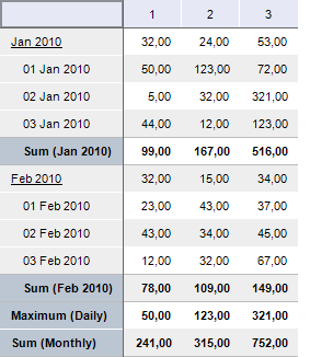 After executing the example clicking the button calculates the following totals for the table: by Days level - maximum value; by Months level - Sum.