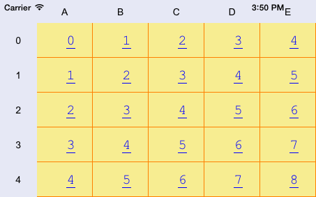 // Create two default styles NuGridCellStyle *firstStyle = [NuGridCellStyle deafultStyle]; // Set the first style name [firstStyle setStyleName:@"This is the first style"]; NuGridCellStyle *secondStyle = [NuGridCellStyle emptyStyle]; // Set the second style name [secondStyle setStyleName:@"This is the second style"]; // Set text font parameters [secondStyle setFont:[UIFont fontWithName:@"Courier New" size:20]]; // Set text font for the second style [secondStyle setTextColor:[UIColor blueColor]]; // Set color for table cell borders [secondStyle setBorderColor:[UIColor orangeColor]]; // Set underlined text style for the second style [secondStyle setUnderline:YES]; // Set text alignment by cell center for the second style [secondStyle setTextAlignment: UITextAlignmentCenter]; // Set table cell background [secondStyle setBackgroundColor:[UIColor colorWithRed:(0.97f) green:0.93f blue:0.57f alpha:1]]; // Merge settings of both styles [firstStyle mergeWith:secondStyle]; // Apply the first style NuGridTheme *theme = [proxyDatasource gridViewTheme:[contr gridView]]; [theme setDefaultStyle:firstStyle]; [proxyDatasource gridView:[contr gridView] setTheme:theme];