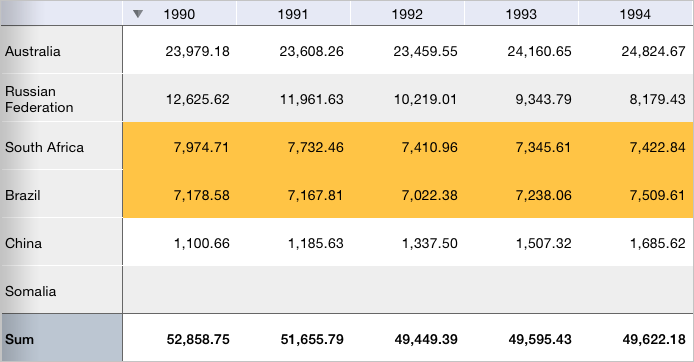 After executing the example the conditional formatting with the use of the rule "Cells between A and B" is applied to the express report whole table. All the cells containing values from 7000 to 8000 are filled with yellow color: