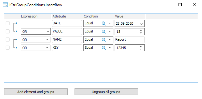 To execute the example, create a form given in the example for the ICtrlGroupConditions.AddRow method. Add two Button components named Button1 and Button2 to the form. For the Button1 component, set the Text property to Add Element and Groups, for the Button2 component, set the property to Ungroup All Groups.