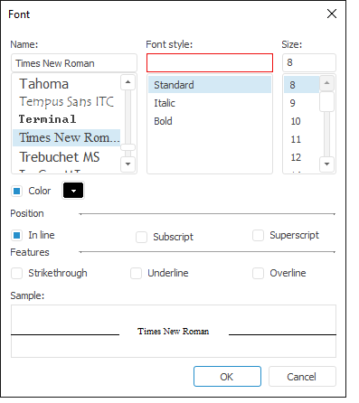 If the property is set to True, when the dialog box opens, the field of font pattern style is empty. The property is set to False by default, the font face style of the component is selected in the dialog box (The font face style set in the Font property).