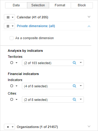 To control data source dimensions, use the Selection group of tabs: shared dimensions are displayed on single tabs, private dimensions are displayed on the Private Dimensions tab. For example: