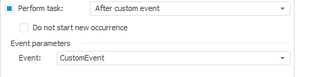 On selecting the After Custom Event option, the task will be executed after custom eventthat is called from the Fore/Fore.NET code. The selection of the custom event will be available on the Schedule tab: