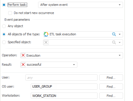 Specified Object. If this radio button is selected, the event is generated after performing a certain operation over specified object of the repository. An object can be selected in the drop-down list or the user can click the
