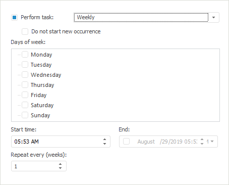 End. Selecting the checkbox enables the user to set time and date of the las task execution. By default the setting is deactivated