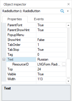 After resources are connected to a form for all visual components in the object inspector, the ResourcesID additional attribute is added to string data type properties. This attribute maps values of resources' row elements with values of string data type properties for visual components. The attribute value is generated automatically and includes the name of the component containing the object, the object name and the property name separated by points.
