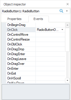 Select the RadioButton1 component in the object inspector and go to the Events tab.