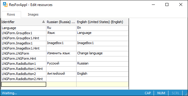 Therefore, on starting the form, components' captions and image in ImageBox1 will match value of the resources' elements for Russian.