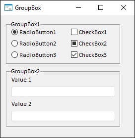 The component is used to group the controls, such as RadioButton, CheckBox, and so on. As opposed to Panel component, the GroupBox component does not have wide opportunities to set different layout styles, and is used to visually group the functionally combined components on a form.
