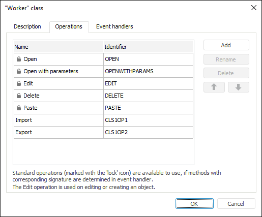 The table displays standard operations by default. Their names and identifiers are prohibited to edit.