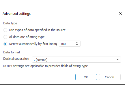 NOTE. Advanced settings of imported data type and format are available for all data sources, except for time series database.