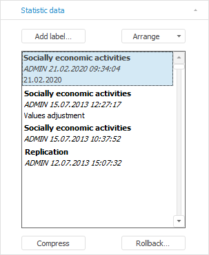 The following information is displayed for each revision and label: name, creator's name and description. For example:
