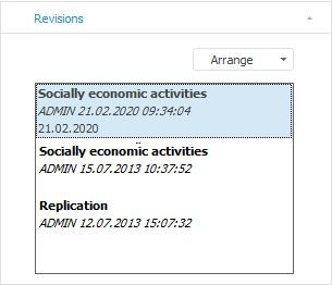 To sort revisions, use the drop-down menu of the Arrange button. Sorting revisions by name or by the date of creation (default) is available.