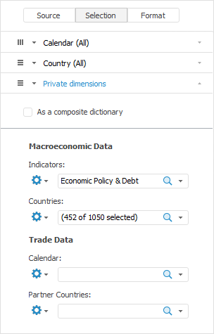 Originally on setting up data display from several data sources shared dimension selection and private dimension selection from the first data source corresponds to the selection configured in the used data sources. Private dimension selection of the second and next data sources corresponds to the selection from saved views of the data sources in use.
