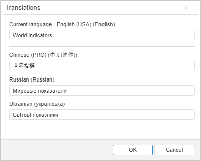 In the Translations dialog box that opens specify report names in different languages: