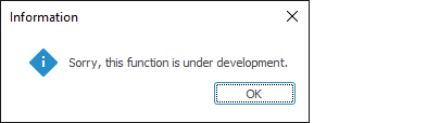 The NotImplementedBox method opens the dialog box with the following message: "Sorry, this function is under development".