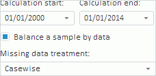 Balance a Sample by Data. Specify, by which observations the correlation coefficient is calculated. The checkbox is selected by default, and all observations on the special point are excluded, if there is missing data on this point at least in one variable. If the checkbox is selected, the correlation coefficients are calculated by all available data.