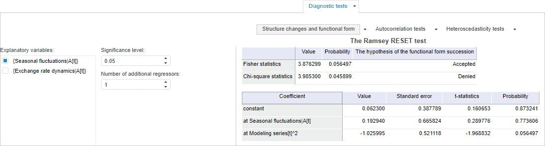 TIP. To calculate diagnostic tests using the R methods, select the Use R on Calculating Descriptive Statistics checkbox on the Calculation tab in the Parameters dialog box. The feature is available for all tests except from the White test if Foresight Analytics Platform has R package connected. For details see the How to Set Up Integration with R? section.