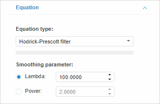 Power. Smoothing parameter depends on the power value, which should be greater than zero. The default value is 2. The parameter is not available for the Hodrick-Prescott Filter (R) model.