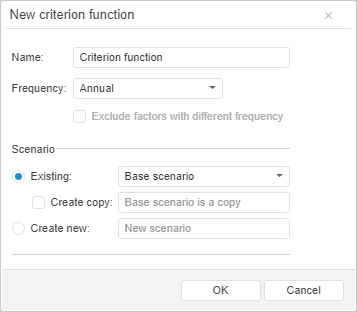 NOTE. A criterion function is calculated only in scenario modeling. If the single-variant modeling is used, on creating a criterion function the scenario modeling is enabled automatically.