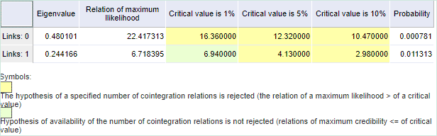 The test is executed simultaneously for all selected variables. To find cointegration relations, the maximum likelihood relation values are compared with the N percent (N = 1%, 5%, 10%) significance level. If the maximum likelihood relation value is greater than the significance level, the hypothesis about cointegration relations existence is rejected.