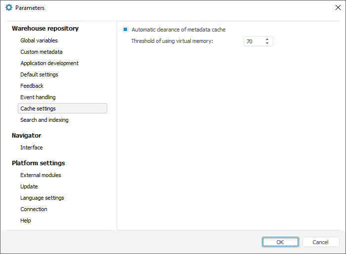 Metadata of objects that are worked with, are cached in the virtual memory. If objects are multiple, addressing them may cause the large amount of virtual memory to be used for caching. To avoid it, Foresight Analytics Platform uses the mechanism of automatic metadata cache clearance. By default, the cache is cleared if 70% of available virtual memory is occupied. The Automatic Clearance of Metadata Cache checkbox changes working parameters of automatic metadata cache clearance mechanism. If the checkbox is selected, the Threshold of Using Virtual Memory box is available to specify the volume of used virtual memory in percents, exceeding of which will cause cache clearance.