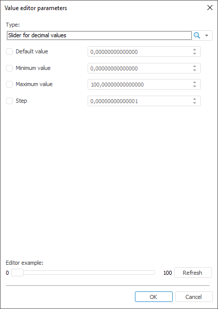 Default Value. Determine the editor value to be displayed by default. This value must be in the range of available values determined for the editor. If the range of available values for the editor is not set, the value must be in the range [-5.0 x 10-324; 1.7 x 10308].
