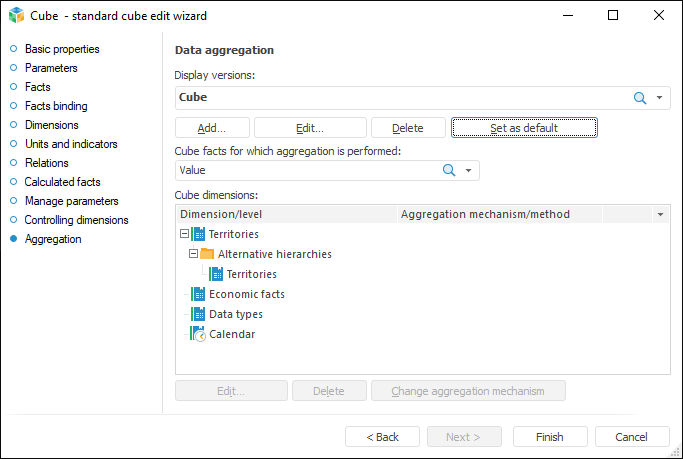 This page is used to set up display versions and aggregation for cube dimensions. A detailed description of setting up various aggregation mechanisms is given in the Aggregation by Dimension Levels section. Disaggregated data is extracted on opening the cube. Data is aggregated in the opened cube in the client workstation.