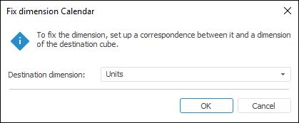A dialog box opens for source cube dimensions. Select the required dictionary of the destination cube to establish a correspondence: