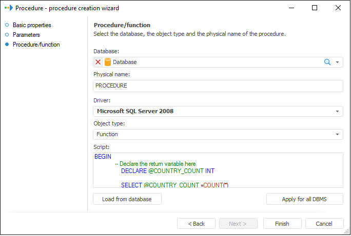 Procedure. It enables the user to create procedures and functions for various DBMS. Unlike the DBMS command, a stored procedure or function is created on the server when the Procedure object is created in the repository.