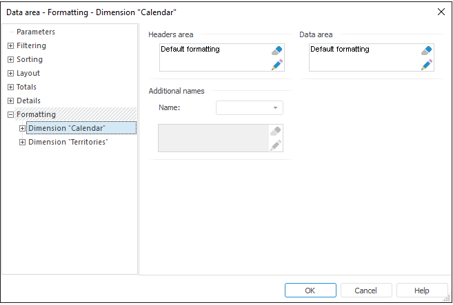 Along with general formatting parameters of data area, the user can set up formatting up to dimension levels.