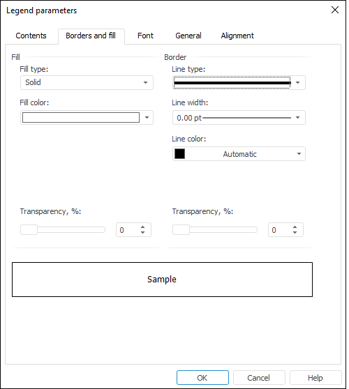 To set up common legend borders and fill, go to the Borders and Fill tab of the Legend Parameters dialog box.