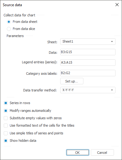 A cell range may be set as a combined or rectangular area. When several ranges are used, chart series are displayed in the order of ranges selection.